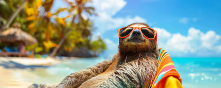 Sloth wearing sunglasses reclining on a beach.