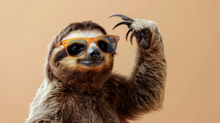 Sloth with sunglasses on beige background, funny animal portrait. Quirky and humorous concept.