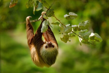 Cute sloth hanging on tree branch. Perfect portrait of wild animal in the Rainforest of Costa Rica.