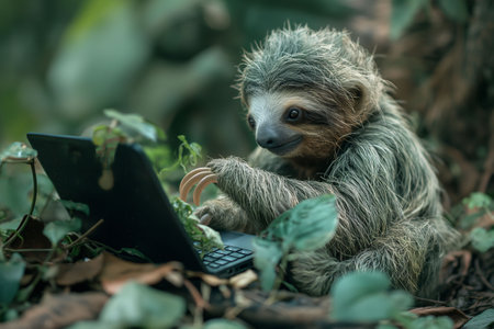 An adorable old sloth sitting in a forest setting and watching something in a computer, a lovely and funny meme on social media. High quality photo