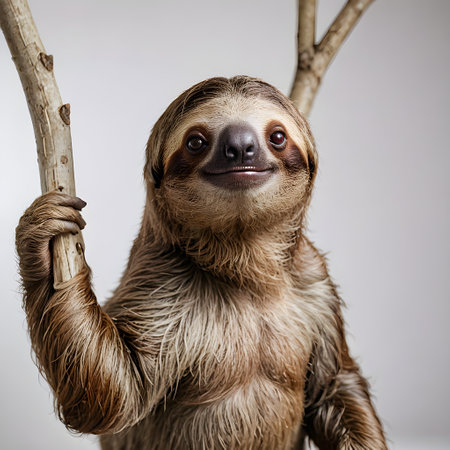 sloth hangs upside down from a branch, showcasing its slow movement and unique charm against a pure white backdrop, embodying relaxation and tranquility.