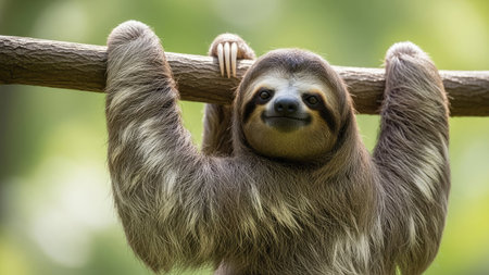 A sloth clings to a tree branch, captured in a close-up shot. The animal features brown and gray fur, set against a blurred green backdrop suggesting a forest habitat. The lighting appears natural, highlighting the textures of the fur and branch, useful for various commercial and editorial applications.