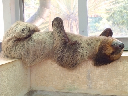 Lazy sloth is lying at the window