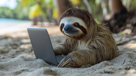 A sloth sits on the sandy beach typing on a laptop, surrounded by tropical palm trees.