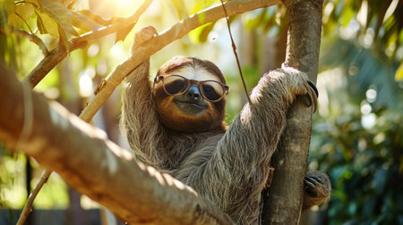 Funny sloth hanging on tree branch with glasses. Cute sloth hanging on tree branch