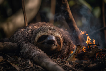 Image of sloth exhausted in the midst of wildfires and smoke. Wildlife Animals. Illustration. Generative AI.