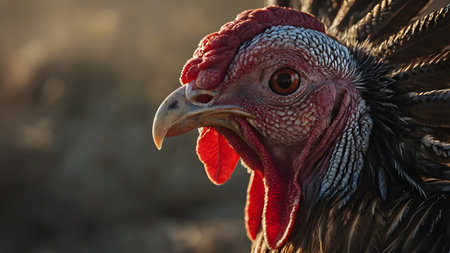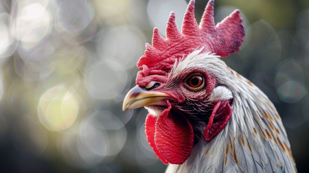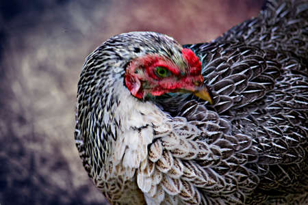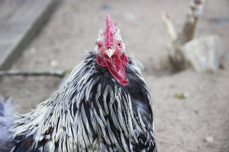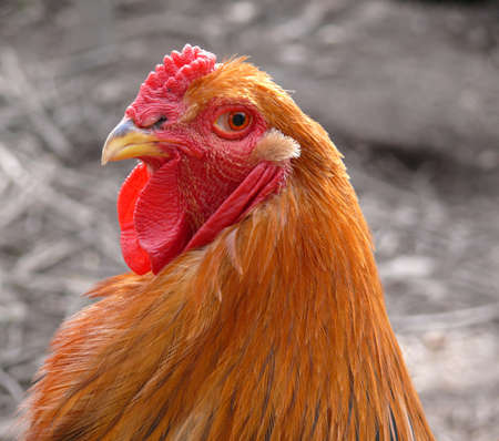 Farm living bird rooster looking around, head portrait, beak and crest