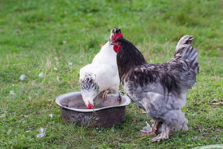 portrait of a white brahma chicken drinking water, popular american breed, Farm animals