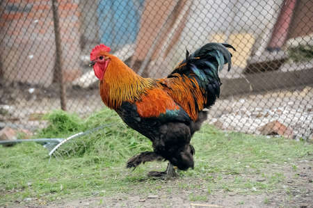 Beautiful multi-colored thoroughbred cock on a bird farm.
