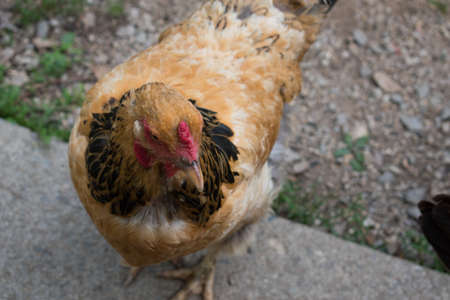 Chickens on a poultry farm. One chicken looks into the camera lens. Household.
