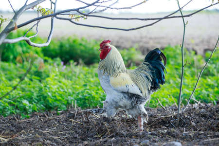 proud colorful rooster struts across the meadow