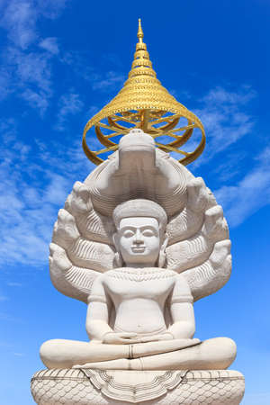 Sculpture about Buddha image is Buddha posture sit on base and feel happy on sky background.