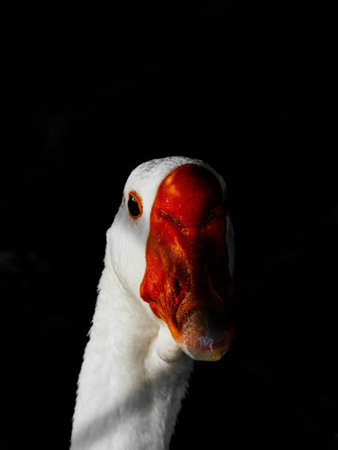 portrait of a white goose on a black background close-up