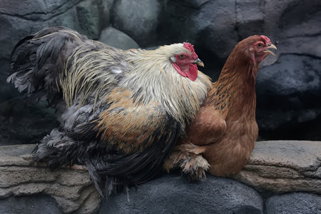 Rooster and hen in a rural setting, closeup of photo