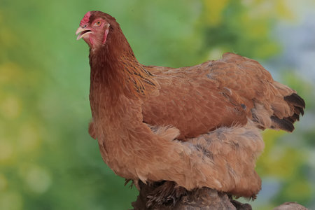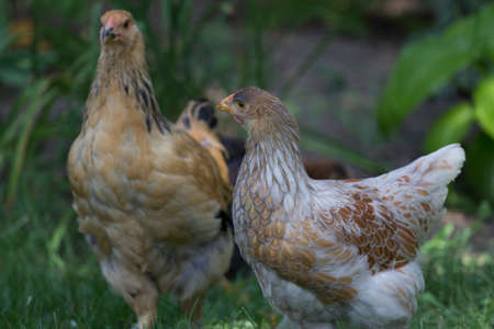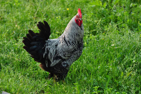 Cute chicken walks on a green lawn in the park, beautiful bird