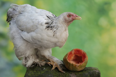 White hen with fruit on green background. Close-up.