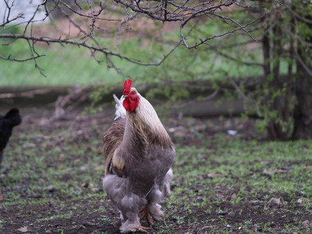 Home rooster running around the yard