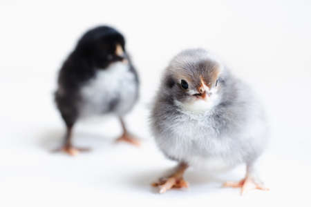 Gray and black newborn chicks on a white background, selective focus