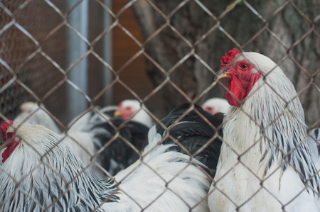 angry chicken behind bars in country garden