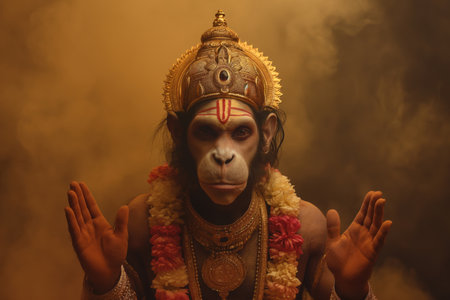 Man representing the hindu monkey god hanuman is posing with his hands raised against a smoky backdrop