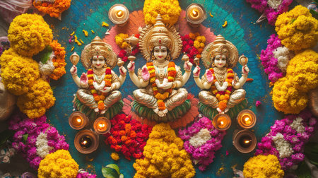 Hindu deities placed on a colorful rangoli with oil lamps and marigold flowers. High angle view, copy space