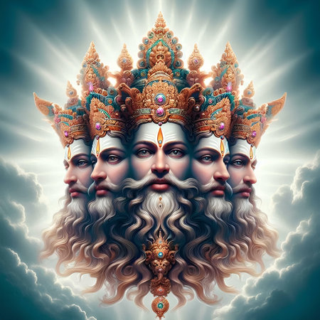 Three gods Dattatreya Trimurti (Divine Trinity) Sculpture in Grand Bassin Temple (Ganga Talao) on the lake bench - a sacred place for pilgrimage of Hindu people in district Savanne, Mauritius.
