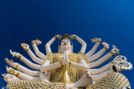 White and gold statue of the many-armed Buddha against the Indigo sky. Religions of Southeast Asia. Temple in Thailand on the island of Koh Samui. Tourist destination Thailand. Wat Plai Laem.