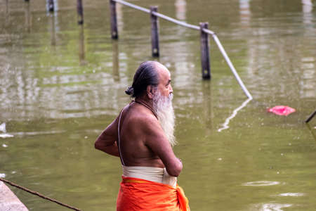 Mayiladuthurai, Tamil Nadu, India - February 2020: An elderly Indian priest with a long white beard dressed in a saffron loincloth in the holy tank of the ancient Hindu temple at Vaitheeswaran Koil.