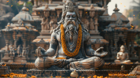 Meditative Indian statue decorated with marigold garland, ancient temple background