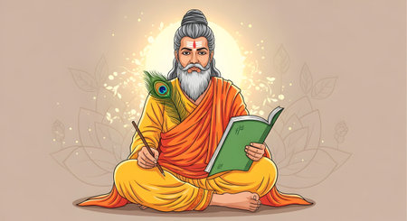 A Illustration of sage Valmiki sitting with manuscript and peacock feather pen symbolizing Ramayana Sanskrit literature culture tradition and Indian heritage for Valmiki Jayanti celebration