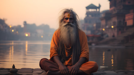 An old yogi was meditating on the bank of the Ganges River. It was quiet amidst the morning sunshine. Behind him is the view of Varanasi. It is a symbol of peace, tranquility and faith in Hinduism.