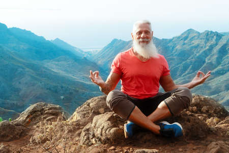 Senior athlete man with white beard and tattoo greeting sunrise and meditating, mindful living and healthy wellbeing concept