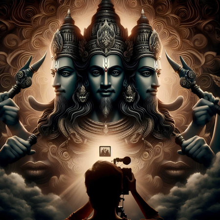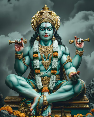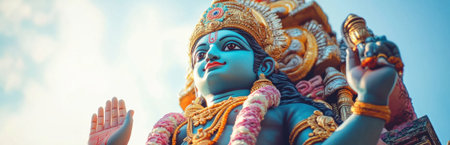 A stunning statue of a Hindu deity, showcasing intricate artistry and vibrant colors, set against a beautiful sky. Perfect for cultural and spiritual themes.