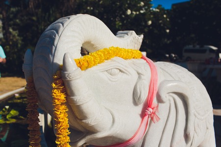 White elephant sculptures with yellow marigold flowers.