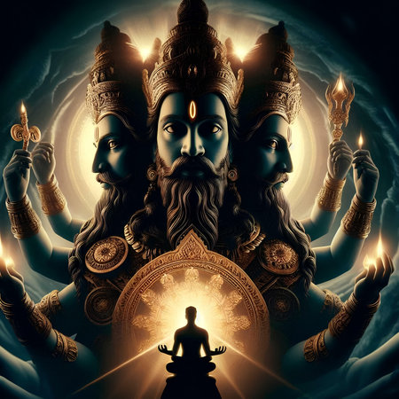 Three gods Dattatreya Trimurti (Divine Trinity) Sculpture in Grand Bassin Temple (Ganga Talao) on the lake bench - a sacred place for pilgrimage of Hindu people in district Savanne, Mauritius.