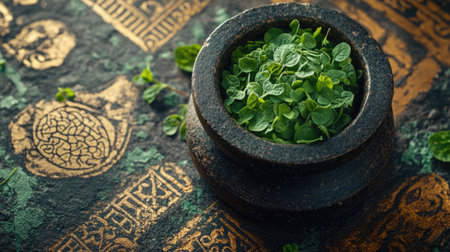 Close-Up of Bacopa Leaves Gently Ground in Mortar with Ancient Ayurvedic Scrolls and Brain Memory Symbols in Background.
