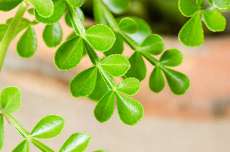 Fresh green Kalanchoe leaves on the blurred floral background. Copy space. Kalanchoe blossfeldiana.