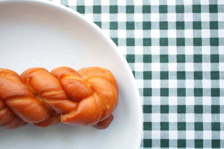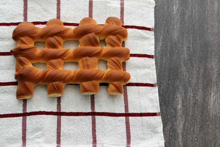 Fresh, fresh, fluffy sweet bread in the shape of a grate on a wooden table on a napkin to keep warm