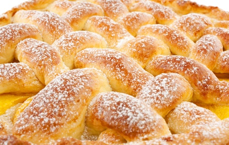Closeup of braided almonds cake on white background on top view