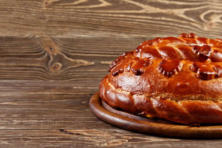 Close-up food photography of baked decorative yeast dough pie in a round shape.