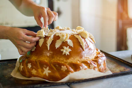 Woman's hands touch decorated bread. Pastry on oven tray. Preparation of wedding bread. Art and customs.