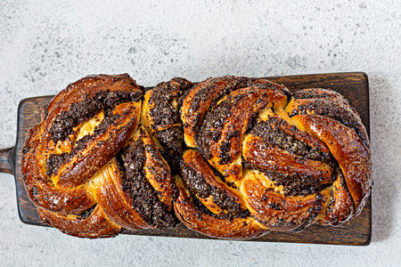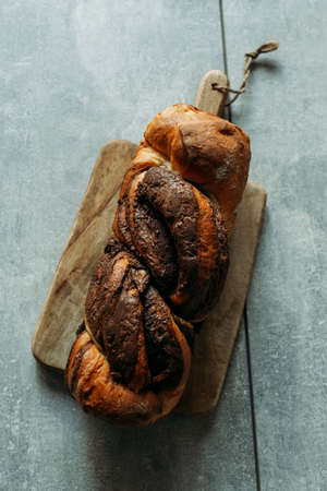 Freshly baked brioche/Babka with poppy seeds and chocolate on a wooden board. Braided dessert bread. Homemade baking, national pastries. Estonian kringle in the shape of a brick.