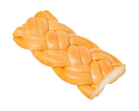 Suluguni smoked pigtail cheese, cut part, isolated on white background