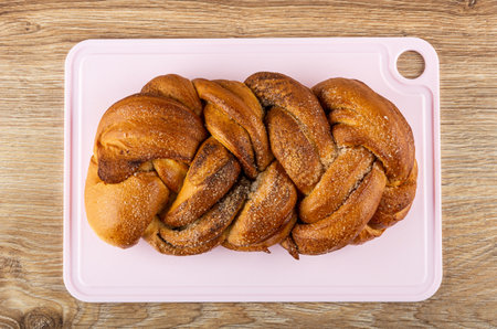 Wicker sweet bun with cinnamon on pink cutting board on wooden table. Top view