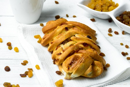 Sweet Braided Bread with raisins on kitchen towel on white wooden background.