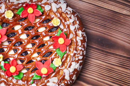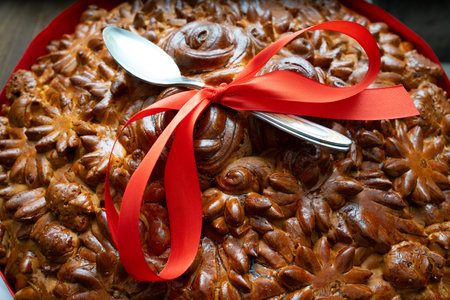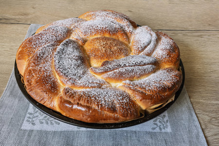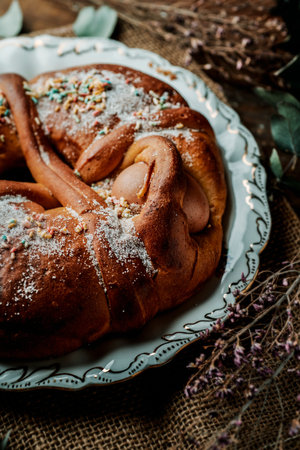 Top view of a braided homemade cake. Easter evening. Orthodox Holiday