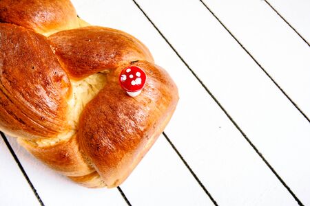 Homemade Easter bread on a white wooden background