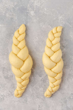 Raw loaf of challah Jewish bread on a light gray background. Top view, copy space