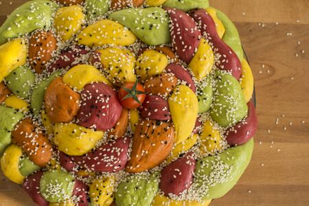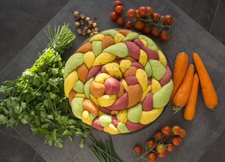Colorful bread made of vegetables. Fresh ingredients top view photo. Wooden table background.