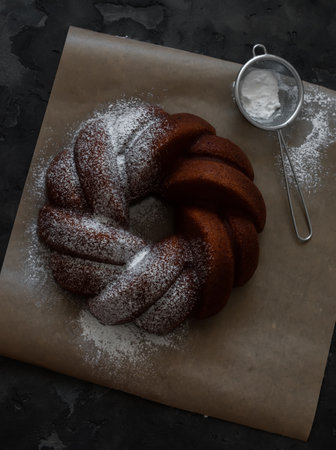 Traditional banana cake with powdered sugar on a dark background, top view